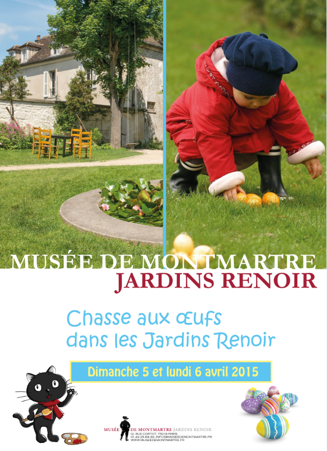 Chasse aux oeufs dans les Jardins Renoir 12 rue Cortot, 75008 PARIS Dimanche 5 et lundi 6 avril de 14h à 17h30 Gratuit pour les enfants de – de 10 ans Compris dans le prix du billet d’entrée (5,50€) pour les 10 à 12 ans Inscriptions obligatoires : 01 49 25 89 41 ou groupes@museedemontmartreHappy Day Of Pâques
