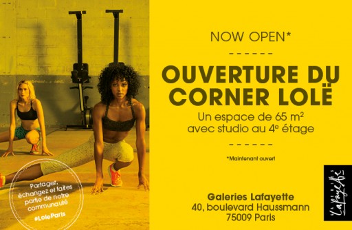 Bonne nouvelle pour les Parisiennes, Lolë fait son entrée au 4e étage des Galeries Lafayette Haussmann à Paris! Le corner est vraiment agréable et en plus on vous propose de participer à des cours de yoga, pilates, fitness dans le studio juste à côté. Il y a même des cours de yoga pour les enfants. Et c’est sans obligation d’achat. Il suffit de s’inscrire aux cours Lolë.