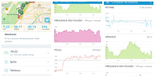 - lorsque je cours, j’utilise de préférence RUNKEEPER qui me permet d’avoir le tracé de mon parcours, ma propre vision des kilomètres et des calories consommées et maintenant, l’évolution de ma fréquence cardiaque sur le trajet.