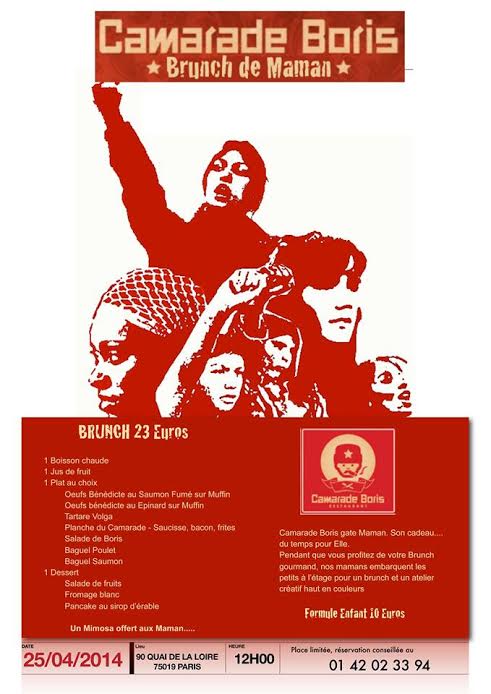 Venez déguster le délicieux brunch du Camarade Boris. Une ENORME surprise vous est réservée : du temps pour votre couple. Pendant que vous bavardez tranquillement avec votre moitié, tout en dégustant les délices dans votre assiette, vos enfants partent bruncher avec leurs petits copains et participer à un atelier créatif. Ça n’est pas beau?Compte tenu des escaliers, je conseille ce brunch pour les enfants de plus de 3 ans.